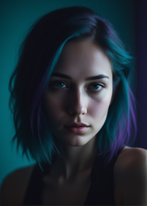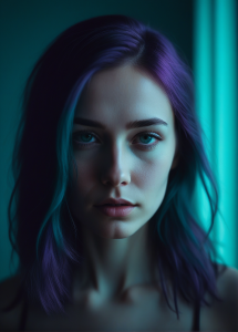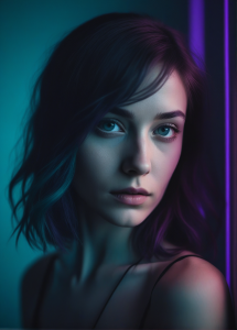 Neon-noir portrait, cinematic low-key, soft split lighting,