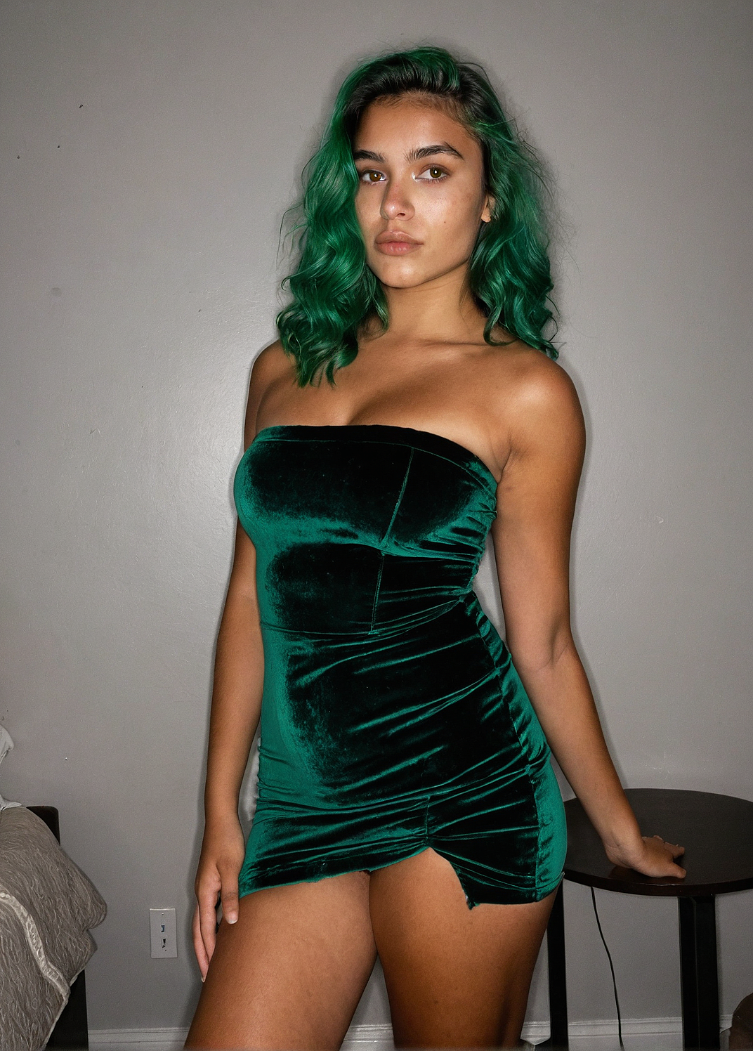 When she walked into the room, the light from the window hesitated — as if it needed a moment to figure out how to illuminate her. Her hair, deep emerald and impossible to ignore, looked like something between quiet courage and unfiltered calm.