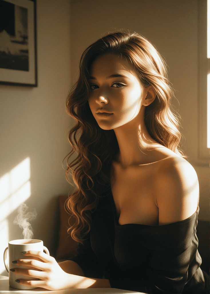 She sat across from him, slowly unfastening the top buttons of her thin black shirt until the fabric simply loosened at her shoulders, revealing only her collarbones. Nothing more. It wasn’t about exposing her body. It was about exposing her presence — the delicate kind of readiness that appears when a woman allows herself to be truly seen. He didn’t move closer. Instead, he placed his hand on the table, leaving a space between them that suddenly felt intentional. Not distance — choice.